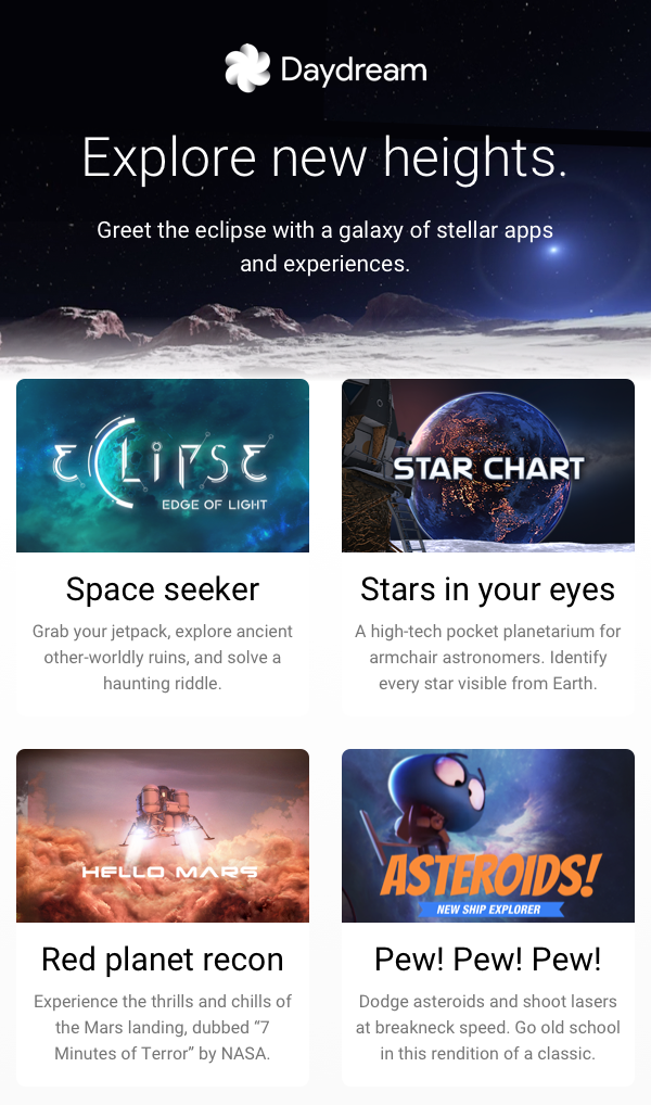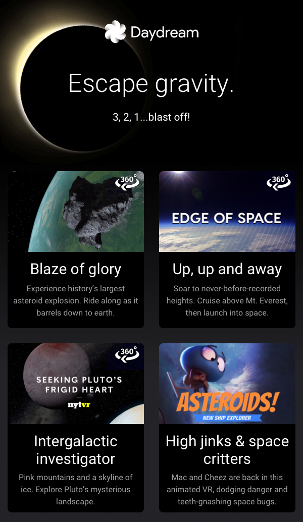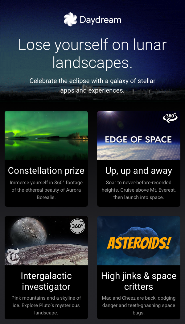 Led design for Daydream VR’s debut campaign. Created immersive experiences timed with flagship phone launches.